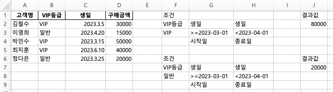 VIP 고객 중 생일이 3월인 고객의 총 구매 금액은 얼마일까요?🤔 "고객정보" 범위에서 "VIP등급" 필드가 "VIP"이고, "생일" 필드가 3월인 모든 행의 "구매금액" 필드 값을 합산하려면 =DSUM(고객정보,"구매금액",{"VIP등급";"VIP";"생일";">=2023-03-01";"<2023-04-01"}) 처럼 작성하면 됩니다! DSUM 함수, 정말 만능 재주꾼이죠?! 🤩