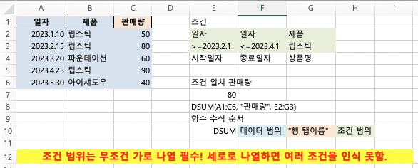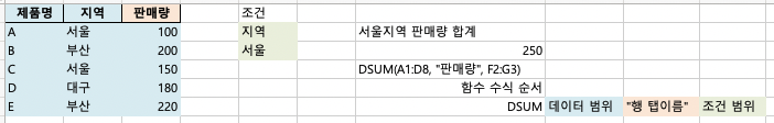 =DSUM(A1:C10, "판매량", E1:E2)또는=DSUM(A1:C10, 3, E1:E2)