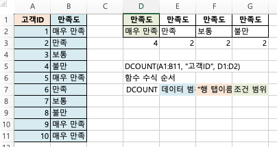 고객 만족도 조사 결과를 분석할 때도 DCOUNT 함수가 빛을 발합니다! "매우 만족"이라고 응답한 고객의 수를 알고 싶다면?! 데이터베이스 범위를 설문조사 결과로, 필드를 "만족도", 조건 범위를 "매우 만족"으로 설정하면 됩니다. 이렇게 얻은 데이터를 통해 서비스 개선 방향을 설정하고, 고객 만족도를 높이는 전략을 세울 수 있겠죠?! 고객 만족, 매출 증가, 두 마리 토끼를 잡을 수 있는 비법! 바로 DCOUNT 함수랍니다!