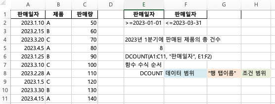=DCOUNT(A1:C11, "판매량", E1:G2)