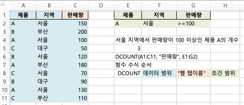| 제품 | 지역 | 판매량 | | A | 서울 | >=100 |- DCOUNT 함수를 사용합니다.