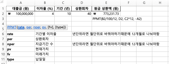 마지막으로 원금 상환액(PPMT) 함수를 살펴보겠습니다. 이 함수는 특정 기간에 상환하는 원금 금액을 계산해 줍니다. 위의 예시에서 3년 차 4번째 달에 상환하는 원금은 얼마일까요? PPMT 함수를 활용하면 약 773,231.73원이라는 것을 알 수 있죠!