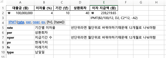 PMT 함수 이자율 입력 방법