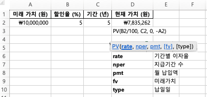 현재 가치(Present Value, PV) 함수
