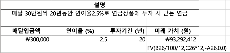 * FV(2.5%/12, 20*12, -300000, 0, 0) = 약 93,292,412원