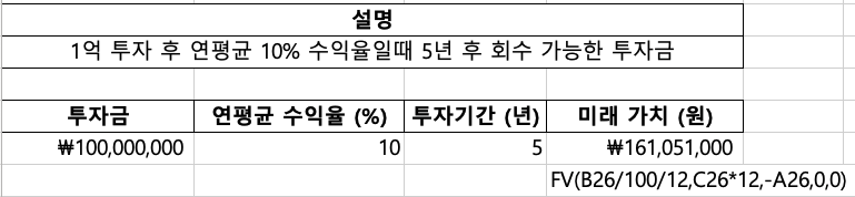 * FV(10%, 5, 0, -10000000, 0) = 약 161,051,000원