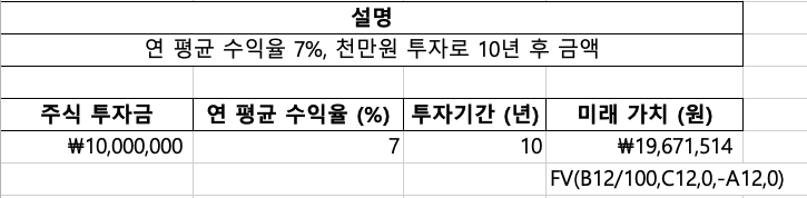 주식 투자에 관심이 많은 박영희 씨는 현재 1,000만 원을 투자했습니다. 연평균 수익률이 7%라고 가정할 때, 10년 후 그녀의 투자금은 얼마나 불어나 있을까요? 궁금하시죠?! FV 함수가 답을 알려드립니다!