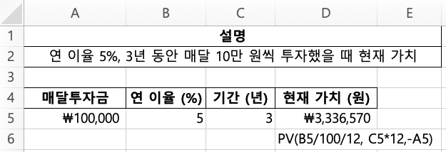 자, 이제 실제 예시를 통해 PV 함수를 더 자세히 알아볼까요? 예를 들어, 연 이율 5%로 3년 동안 매달 10만 원씩 투자했을 때, 현재 가치는 얼마일까요?