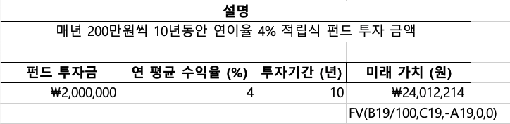 * FV(4%, 10, -2000000, 0, 0) = 약 24,012,214원