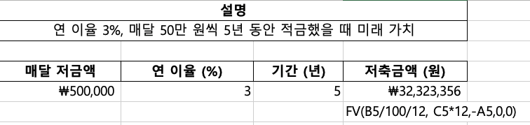 * FV(3%/12, 5*12, -500000, 0, 0) = 약 32,323,356원