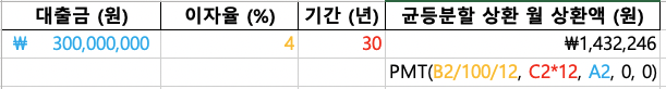 =PMT(4%/12, 30*12, -300000000)결과: -1,432,246원 (대략적인 값) - 짜잔! 매월 약 143만 원씩 납입해야 한다는 결과가 나왔네요! 놀랍지 않나요?!