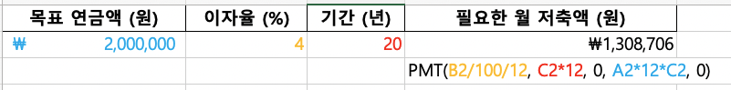 - [type]: 납입 시점을 나타내는 옵션! 0은 기말 납입, 1은 기초 납입을 의미해요. 생략 가능하며, 생략하면 기말 납입(0)으로 처리된답니다.