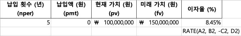 1억 원을 투자하여 5년 후 1억 5천만 원을 회수했다면, 연평균 수익률은 얼마일까요? RATE 함수를 사용하면 간단하게 계산할 수 있습니다!