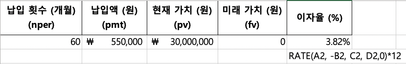 =RATE(60,-200000,0,15000000)결과: 약 0.0079 (월 이자율, 약 8.78% 연 이자율)