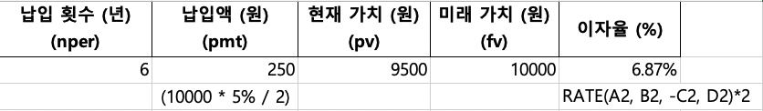 - Nper: 6 (3년 * 연 2회 이자 지급)
