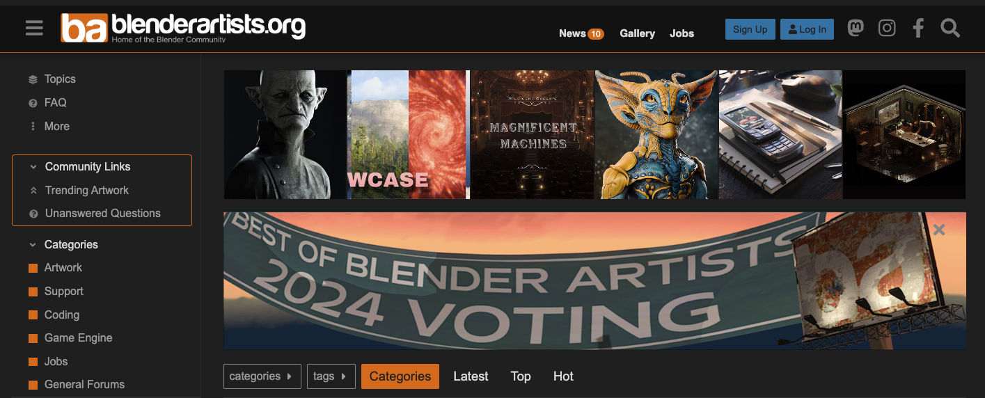 블렌더 공식 커뮤니티! 말이 필요 없죠?! 블렌더 초보자부터 베테랑까지, 다양한 실력의 아티스트들이 모여 서로 교류하고 작품을 공유하는 곳이에요. "블렌더로 이런 것도 만들 수 있다고?!" 하면서 무릎을 탁! 치게 되는 작품들이 정말 많아요. (ㅋㅋㅋ) 튜토리얼이나 팁, 그리고 다양한 정보까지 얻을 수 있으니, 블렌더를 사용한다면 꼭 한번 방문해 보세요! 강력 추천! 💯