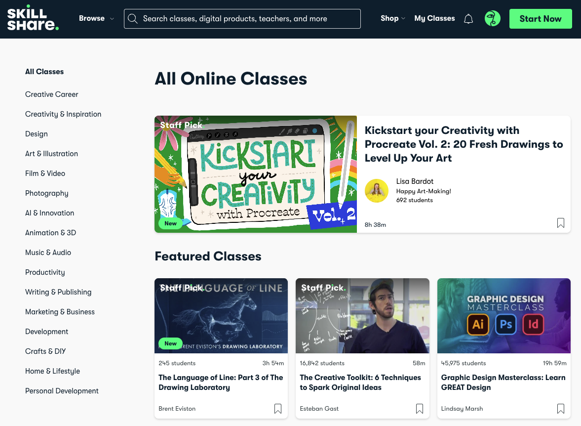 다섯 번째, Skillshare입니다! 🎨 Udemy와 비슷한 온라인 학습 플랫폼인 Skillshare에서도 다양한 블렌더 강좌를 수강할 수 있습니다. Udemy와의 차이점이라면, Skillshare는 월/년 단위 구독 서비스를 제공한다는 점입니다. 즉, 한 번 구독하면 Skillshare에 있는 모든 강좌를 무제한으로 수강할 수 있다는 뜻이죠! 🤯 블렌더뿐만 아니라 다른 디자인 툴 강좌에도 관심이 있다면 Skillshare가 좋은 선택이 될 수 있습니다! 👍