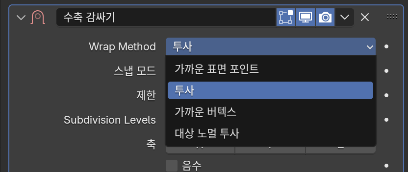 먼저, 오브젝트 모드에서 수축감싸기를 적용할 대상 오브젝트를 선택해 주세요. 그다음 '모디파이어를 추가'를 누르고 변형 탭으로 이동해서 '수축감싸기' 수정자를 추가합니다. 참 쉽죠? 😎 수정자가 추가되면 몇 가지 중요한 설정 항목들이 뿅! 하고 나타날 겁니다.