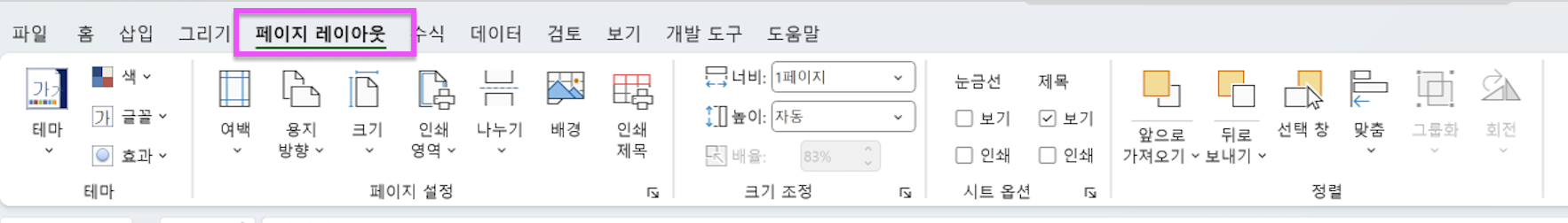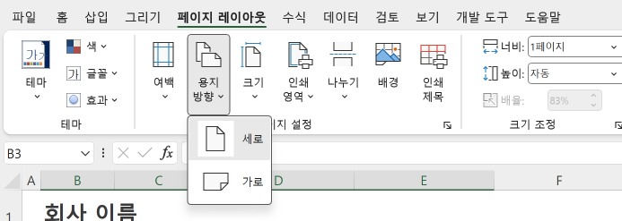 가로로 긴 표는 '가로', 세로로 긴 표는 '세로' 방향으로 설정해야겠죠? '페이지 레이아웃' 탭에서 '방향'을 클릭하면 간단하게 변경할 수 있습니다. 참 쉽죠잉~? 😉