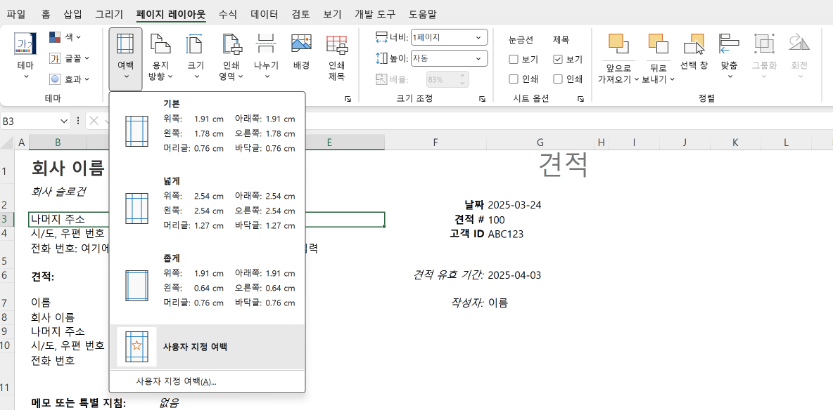 여기서 꿀팁 하나! '페이지 레이아웃' 탭의 '페이지 설정' 대화 상자를 열면 더욱 세밀한 여백 설정이 가능해요! 머리글, 바닥글과의 간격까지 조정할 수 있답니다. 머리글, 바닥글이란 페이지 상단과 하단에 반복적으로 표시되는 텍스트나 이미지를 말해요. 예를 들어 회사 로고나 페이지 번호를 넣을 수 있죠! 하지만, 머리글/바닥글과 여백 설정을 잘못하면 내용이 겹쳐 보일 수 있으니 주의하세요! 마치 화장을 너무 진하게 하면 촌스러워 보이는 것처럼 말이죠!