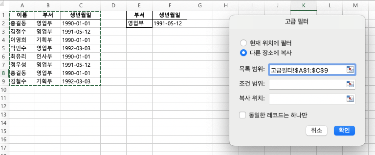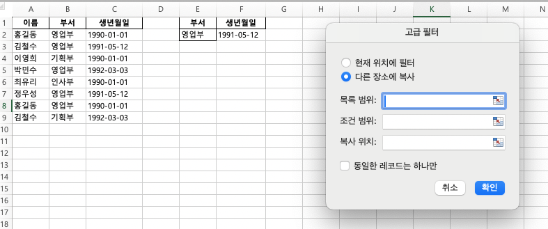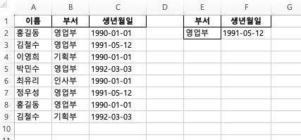 1. 조건 범위 설정: 빈 셀에 조건을 입력합니다. 예를 들어, E1 셀에 "부서", E2 셀에 "영업부"라고 입력하고, F1 셀에 "생년월일", F2 셀은 찾고싶은 생일을 적어주세요. (1991-05-12와 같은 생년월일을 찾을 것이므로!). 이렇게 하면 영업부에 속한 직원 중 생년월일이 같은 사람을 찾는 조건이 완성됩니다!