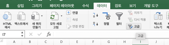2. 데이터 > 정렬 및 필터 > 고급을 클릭합니다.