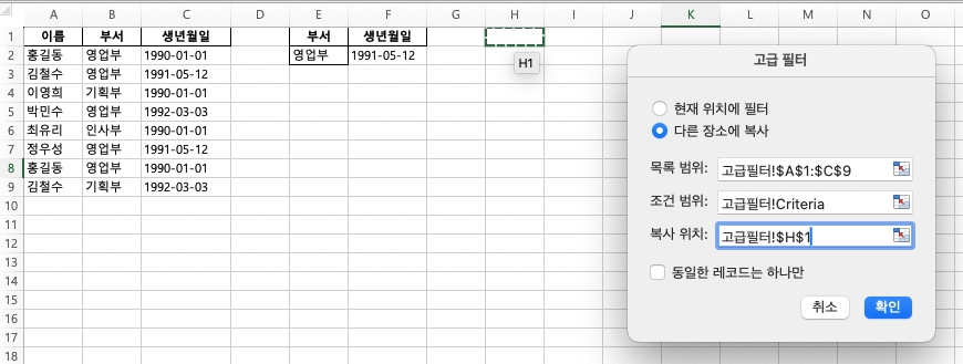 6. "복사 위치"에는 필터링된 결과를 복사할 위치 (예: H1)를 입력하거나 드레그 해주세요. 새로운 시트에 복사해도 괜찮아요!