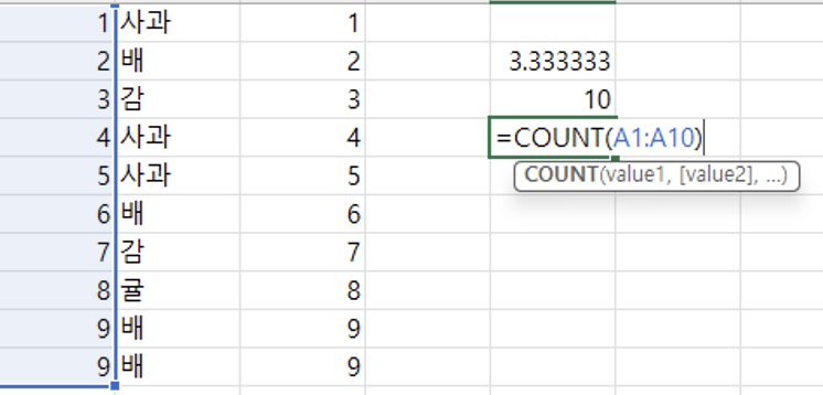 COUNT | 범위 내 셀 개수 | A1:A10 셀의 개수 구하기: =COUNT(A1:A10) |