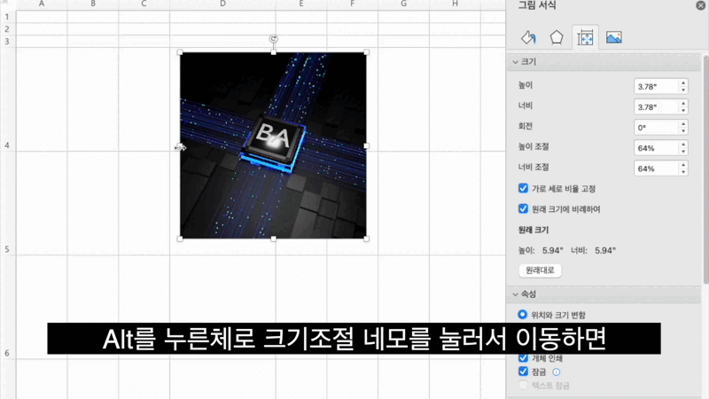 셀안에 사진의 딱 맞게 넣고 싶다면 Alt키를 누른 상태로 이미지 크기조절을 해보세요. 셀모서리에 딱 맞게 이동이 되면서 사진을 드래그해가며 위치를 조절할 필요가 없어요