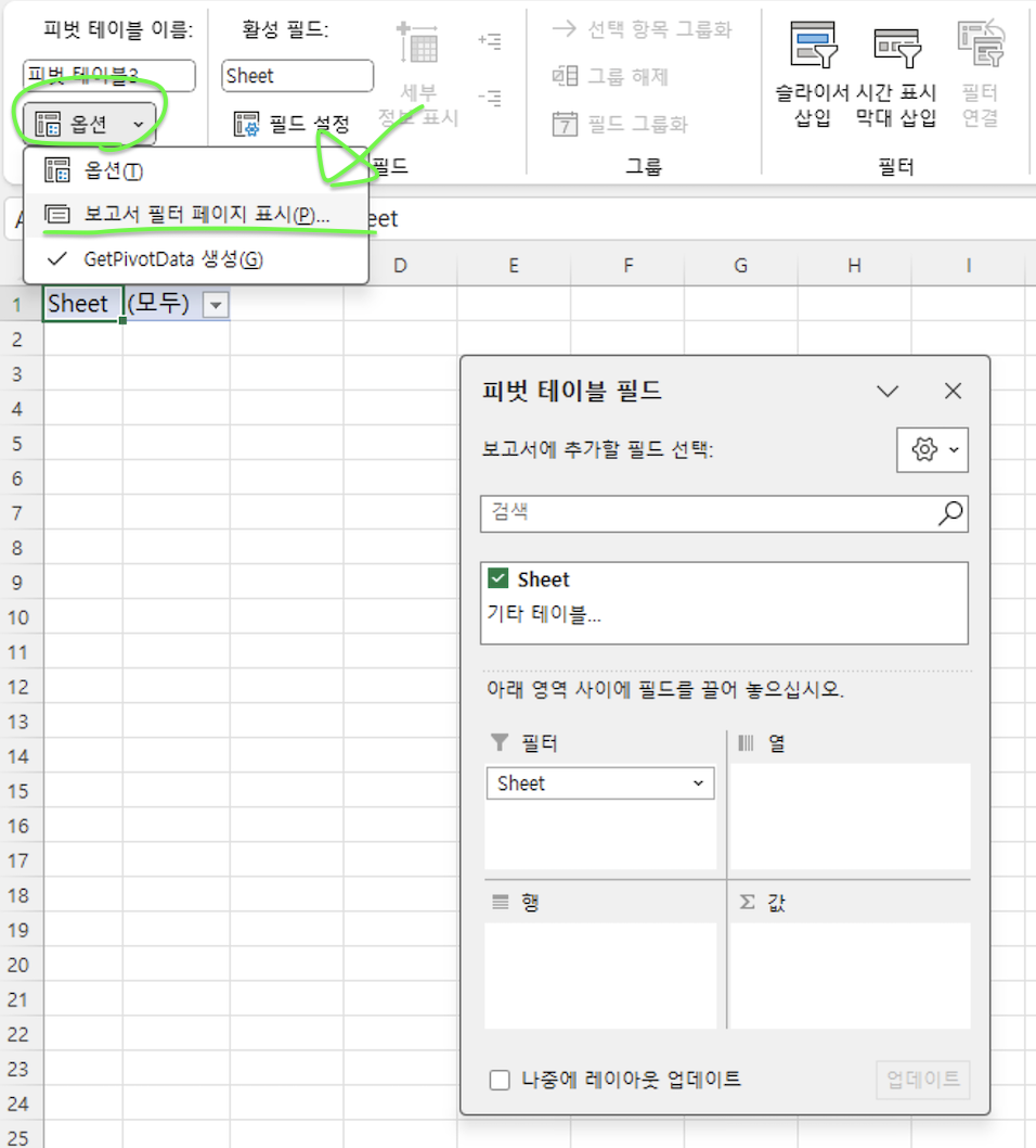 [피벗테이블 분석] - [옵션] - [보고서 필터 페이지 표시] 클릭!🖱️ [확인] 버튼 클릭! 🎉 1월부터 12월까지 시트가 뿅! 하고 나타납니다! 칼퇴근이 눈앞에!🏃♀️💨