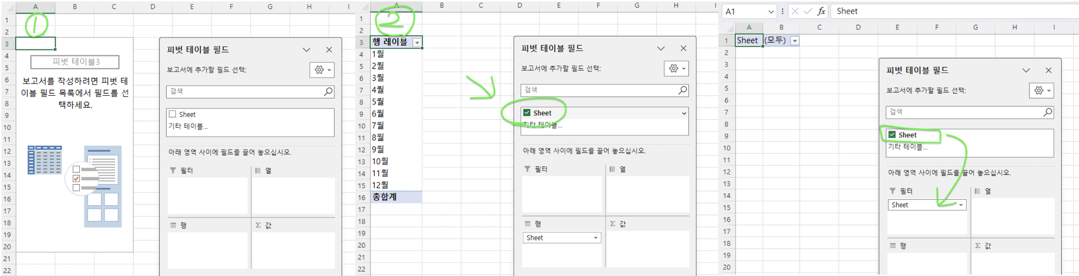 1월~12월 목록 선택 후, [삽입] - [피벗테이블] 클릭! 새 워크시트에 피벗테이블 생성! ✨ 시트명 필드를 "필터" 영역으로 끌어다 놓으세요! 마법의 재료 투입 완료! 🧙♀️ 아래 그림순서 왼쪽부터 오른쪽으로 보시면 되요!