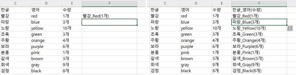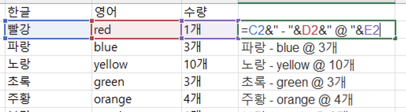 이번엔 분리된 정보들을 하나로 합쳐볼까요? "빨강", "Red", "1개"를 "빨강_Red(1개)" 형태로 만들어 보겠습니다.