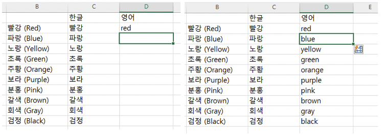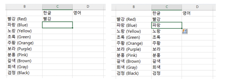 "빨강 (Red)"처럼 한 셀에 모든 정보가 있다고 가정해 볼게요. 다음열 셀에 "빨강"이라고 입력하고, 바로 아래 셀에 커서를 놓고 Ctrl + E! 짠! ✨ 나머지 행에도 이름만 쏙쏙 분리됩니다.