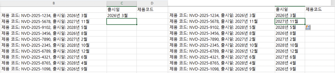 긴 문자열에서 특정 부분만 뽑아내고 싶을 때, "빠른 채우기"는 마치 마법의 돋보기🔎 같아요! "제품 코드: NVD-2025-1234, 출시일: 2026년 3월"에서 출시일만 추출해 볼까요?