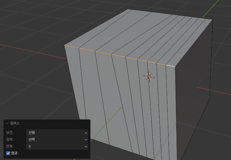 법선 방향을 고려한 루프 컷 루프 컷은 현재 선택된 면의 법선 방향을 기준으로 생성돼요. 만약 원하는 방향으로 루프 컷이 생성되지 않는다면 면의 법선 방향을 확인하고 수정해 보세요! (섬세한 컨트롤의 비밀!)