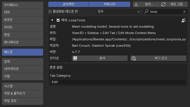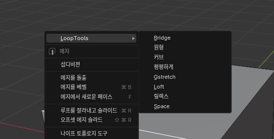 엣지 루프의 균일한 분포를 위해서는 LoopTools 애드온을 활용하는 것도 좋은 방법입니다. 환경설정 -> 애드온탭 -> 검색창에 loop를 검색하면 나옵니다. 활성화 후 선을 선택 후 마우스 오른쪽 버튼을 누르면 loop tools가 추가된것을 확인 할 수 있습니다.