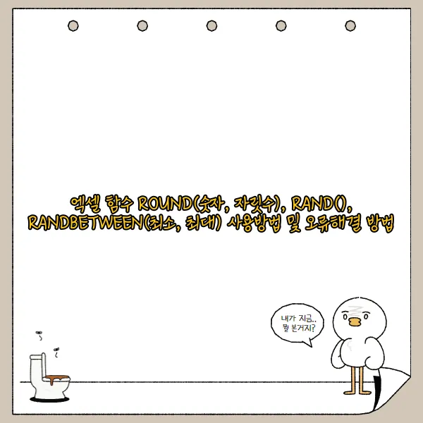 엑셀의 세계, 숫자의 향연에 퐁당 빠져볼 준비되셨나요? 🕺 ROUND, RAND, RANDBETWEEN! 이름만 들어도 벌써 머리가 지끈거리신다고요? 걱정 마세요! 마치 엑셀 함수 마스터가 되는 마법을 부려드리겠습니다. ✨ 복잡한 숫자 다루기, 이제 그만! ROUND 함수로 깔끔하게 반올림하고, RAND 함수로 예측 불가능한 난수의 세계를 탐험해보세요. RANDBETWEEN 함수를 사용하면 원하는 범위까지 지정 가능! 🎲 자, 이제 엑셀 함수 오류와 이별하고, 숫자 마법사가 되는 여정을 시작해볼까요? 함수 사용법부터 오류 해결 팁까지, 흥미진진한 엑셀의 세계가 여러분을 기다리고 있습니다! 😉